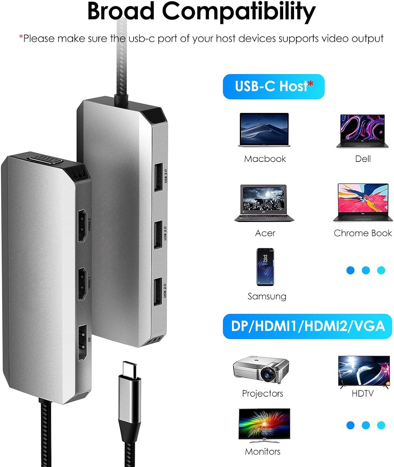 • Compatibilitate larga: Adaptorul este potrivit pentru o gama variata de dispozitive, incluzand Macbook, Dell, Acer, Samsung si multe altele. Asigura-te doar ca portul USB-C al dispozitivului tau suporta iesirea video.
