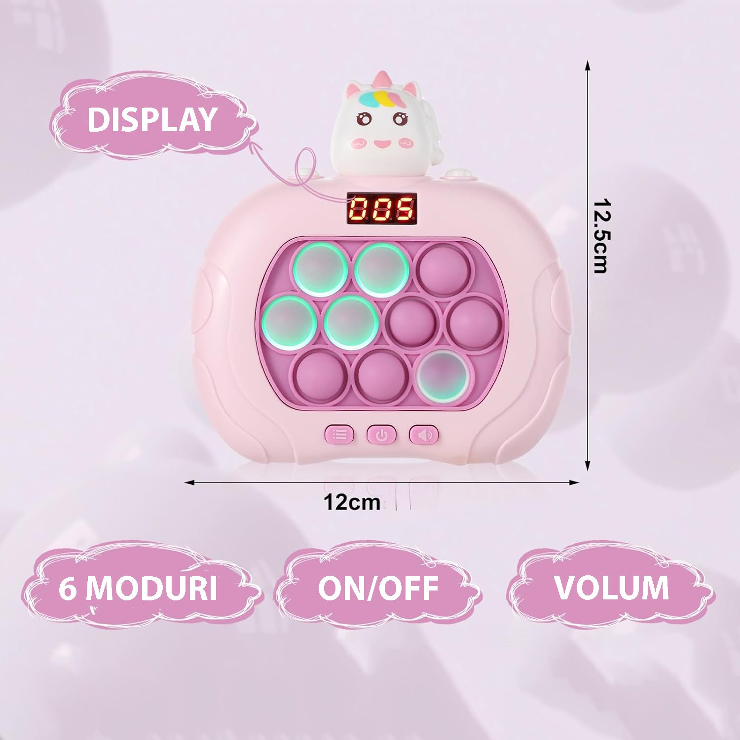 Această jucărie Pop It electronică cu display aduce peste 999 nivele de distracție și 6 moduri de joc. Perfectă pentru copii, ajută la dezvoltarea abilităților cognitive și reduce stresul prin sunete calmante și un design inovativ.