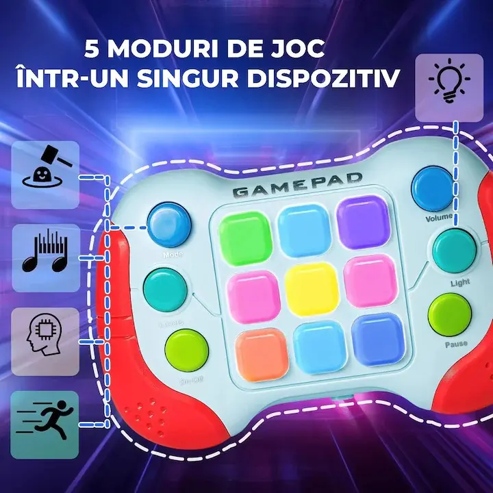 Aceasta consola combina jocul clasic de tip Pop It cu tehnologia moderna: butoane iluminate, efecte muzicale si mai multe moduri de joc.