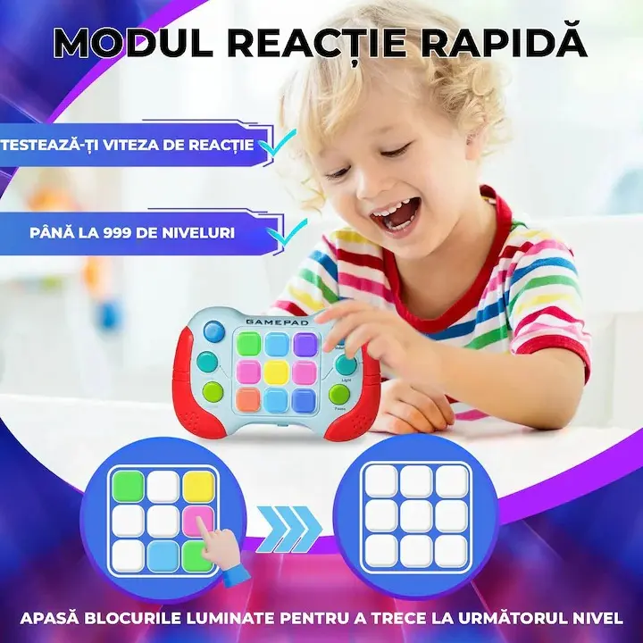 Cu 999 de nivele, lumini RGB si sunete amuzante, consola transforma timpul de joaca intr-o experienta interactiva care antreneaza atentia, memoria si coordonarea mana-ochi.