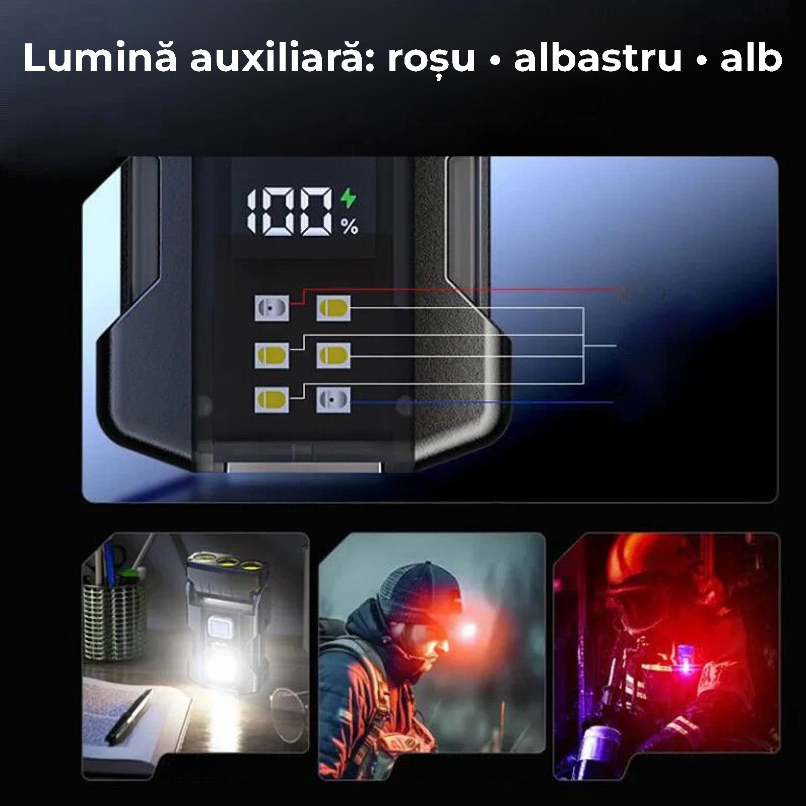 • Lumina alba – trepte low / medium / high pentru citit, lucru la bancul de lucru, reparatii auto sau mers pe jos.