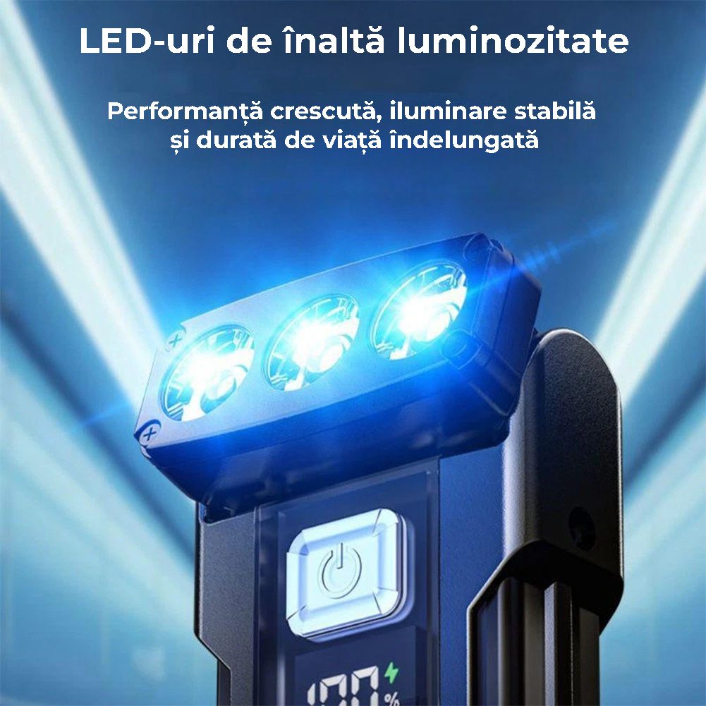 Lanterna LED breloc Miraza combina LED + COB, cap reglabil la 90°, magnet si clip spate, afisaj digital al bateriei si acumulator 1000 mAh reincarcabil USB-C, pentru iluminare puternică si lucru hands-free acasa, la service sau in aer liber.